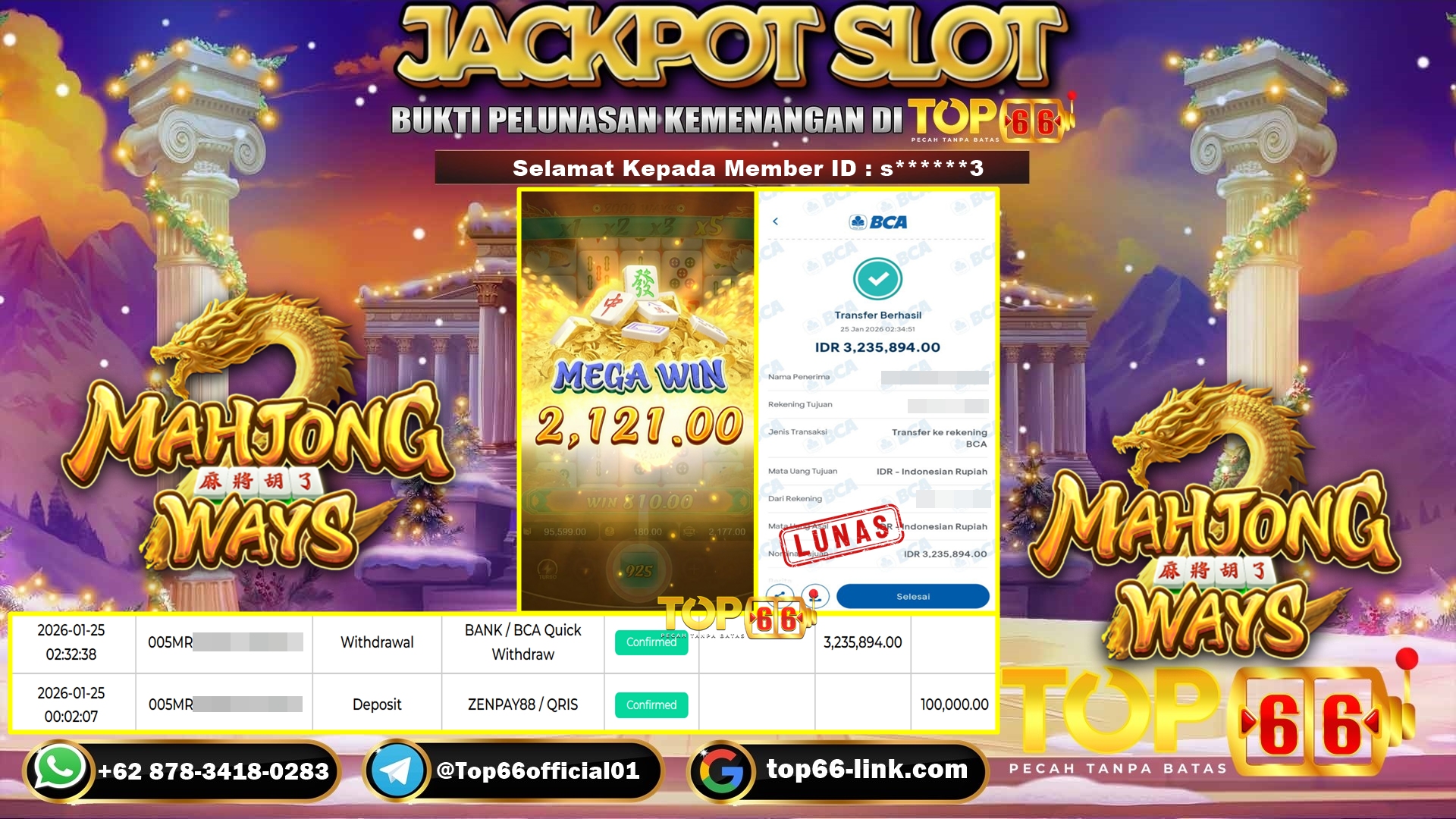 TOP66 – BUKTI KEMENANGAN SLOT MAHJONG WAYS 2 Rp 3,235,894,- LUNAS Selamat Kepada Member ID : s******3, Telah berhasil mendapatkan…