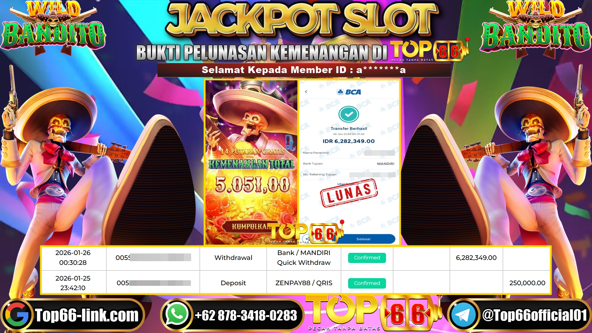 TOP66 – BUKTI KEMENANGAN SLOT WILD BANDITO Rp 6,282,349,- LUNAS Selamat Kepada Member ID : a*******a, Telah berhasil mendapatkan kemenangan…