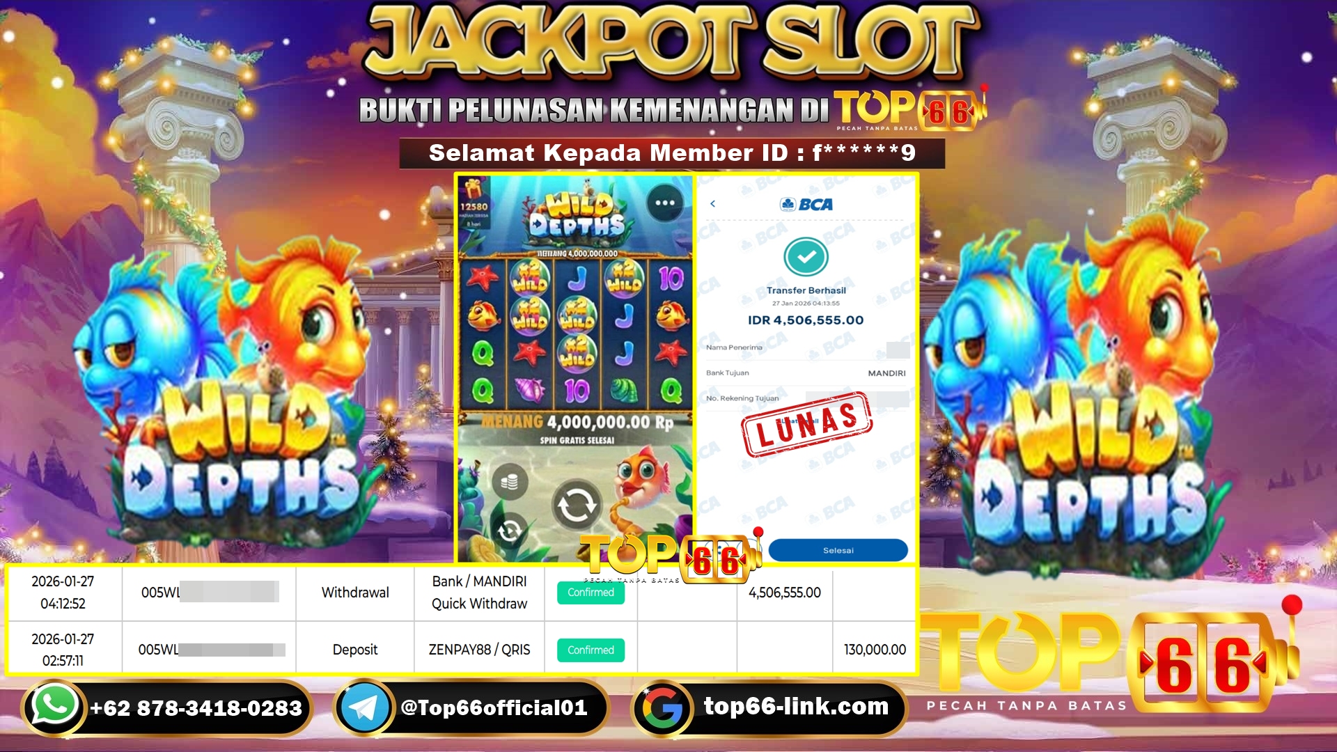 TOP66 – BUKTI KEMENANGAN SLOT WILD DEPTHS Rp 4,506,555,- LUNAS Selamat Kepada Member ID : f******9, Telah berhasil mendapatkan kemenangan…