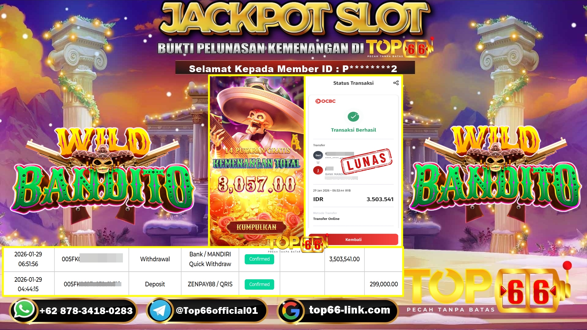 TOP66 – BUKTI KEMENANGAN SLOT WILD BANDITO Rp 3,503,541,- LUNAS Selamat Kepada Member ID : P********2, Telah berhasil mendapatkan kemenangan…