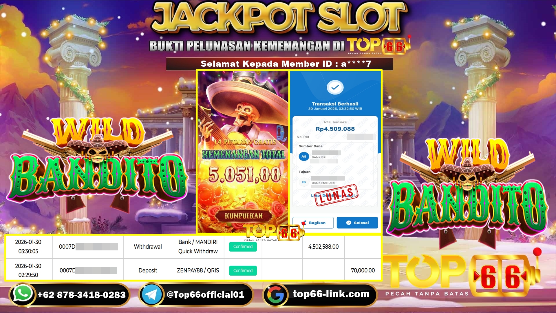 TOP66 – BUKTI KEMENANGAN SLOT WILD BANDITO Rp 4,502,588,- LUNAS Selamat Kepada Member ID : a****7, Telah berhasil mendapatkan kemenangan…