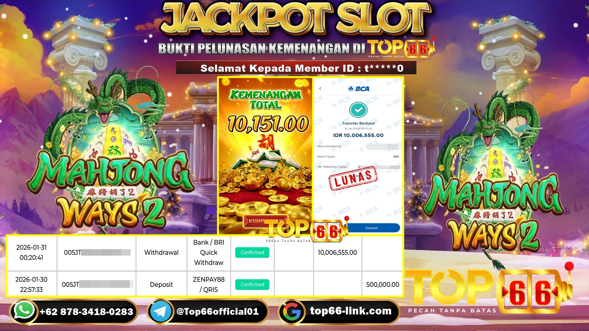 TOP66 – BUKTI KEMENANGAN SLOT MAHJONG WAYS 2 Rp 10,006,555,- LUNAS Selamat Kepada Member ID : t*****0, Telah berhasil mendapatkan…