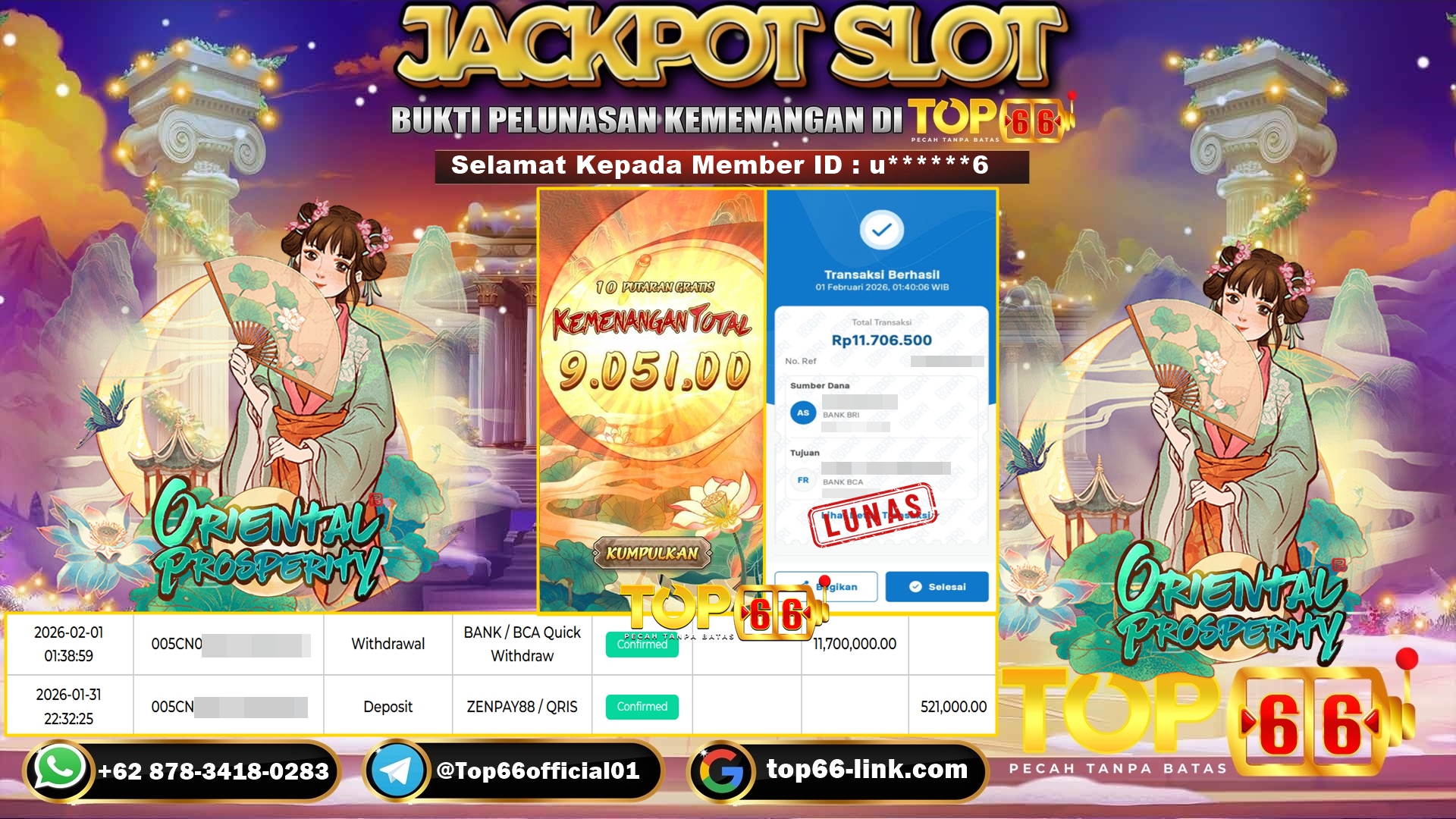 TOP66 – BUKTI KEMENANGAN SLOT ORIENTAL PROSPERITY Rp 11,700,000,- LUNAS Selamat Kepada Member ID : u******6, Telah berhasil mendapatkan kemenangan…