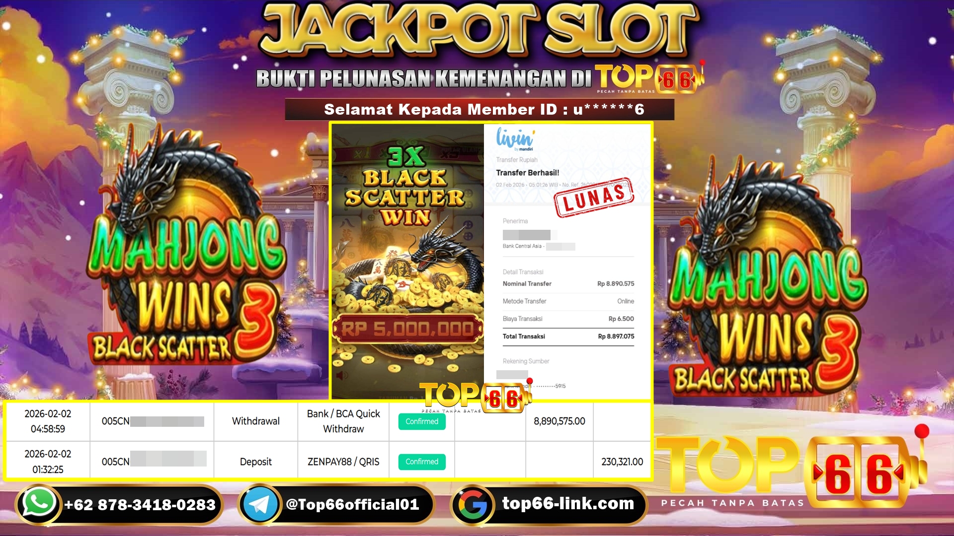 TOP66 – BUKTI KEMENANGAN SLOT MAHJONG WINS 3 – BLACK SCATTER Rp 8,890,575,- LUNAS Selamat Kepada Member ID : u******6,…