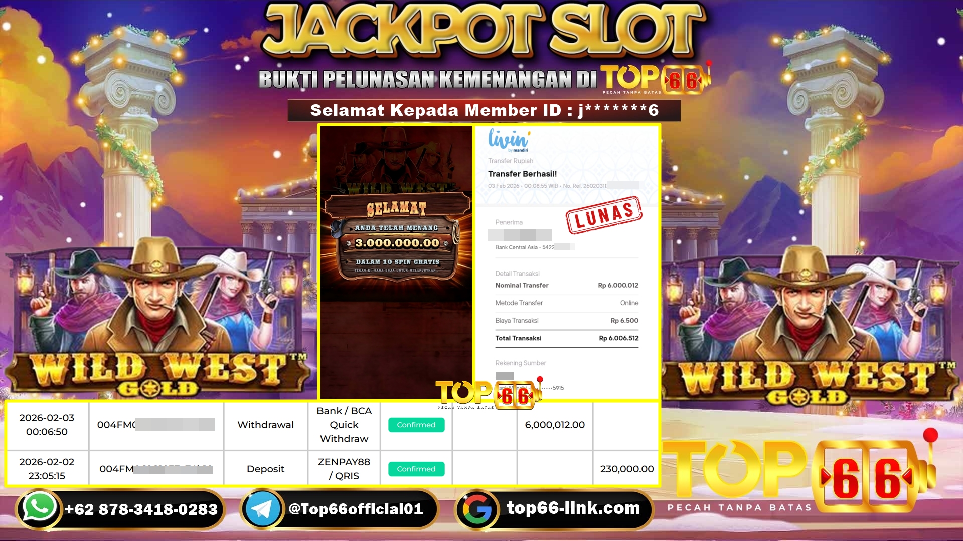 TOP66 – BUKTI KEMENANGAN SLOT WILD WEST GOLD Rp. 6,000,012,- LUNAS Selamat Kepada Member ID : j*******6, Telah berhasil mendapatkan…