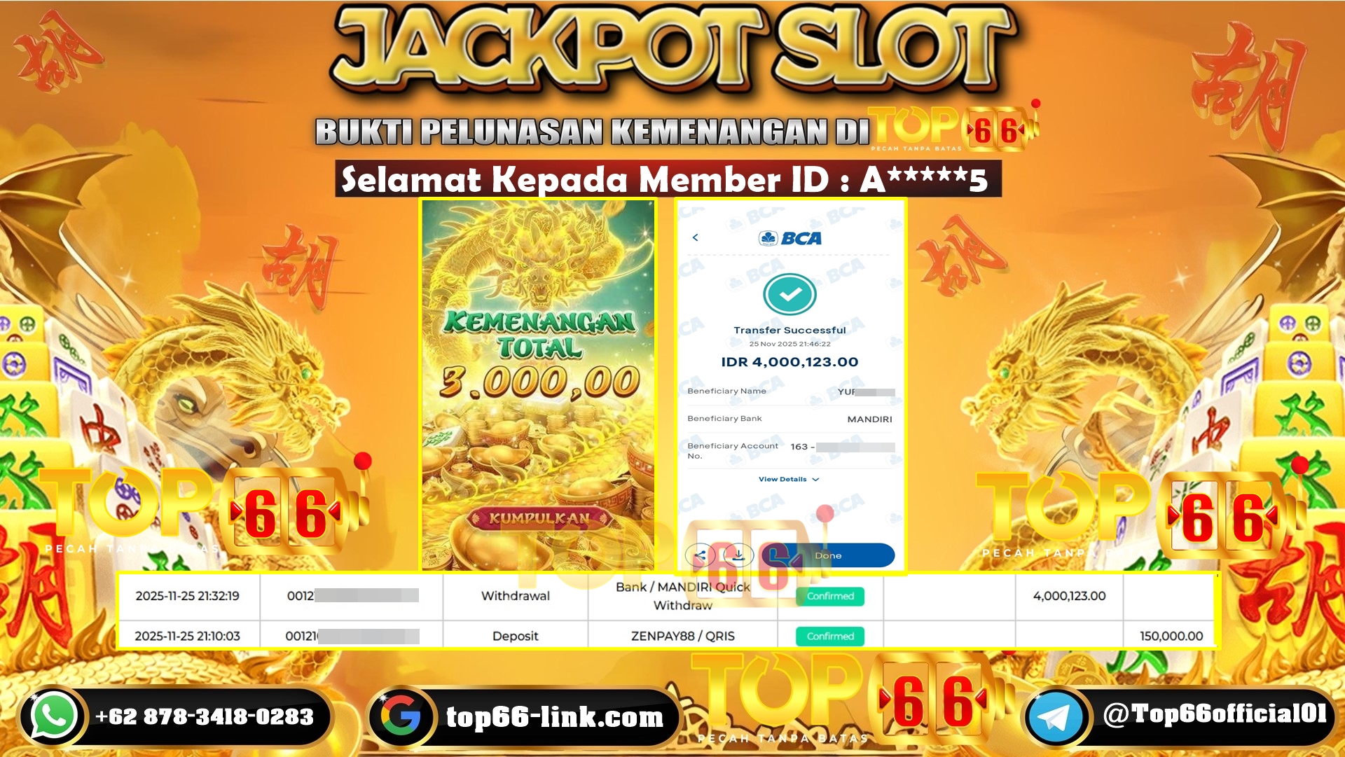 TOP66 – BUKTI KEMENANGAN SLOT MAHJONG WAYS Rp 4.000.123,- LUNAS Selamat Kepada Member ID : A*****5, Telah berhasil mendapatkan kemenangan…
