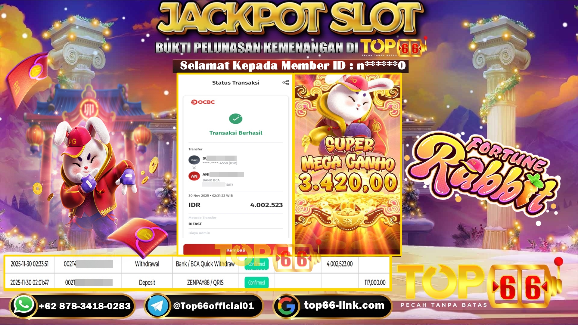 TOP66 – BUKTI KEMENANGAN SLOT FORTUNE RABBIT Rp 4.002.523,- LUNAS Selamat Kepada Member ID : n******0, Telah berhasil mendapatkan kemenangan…