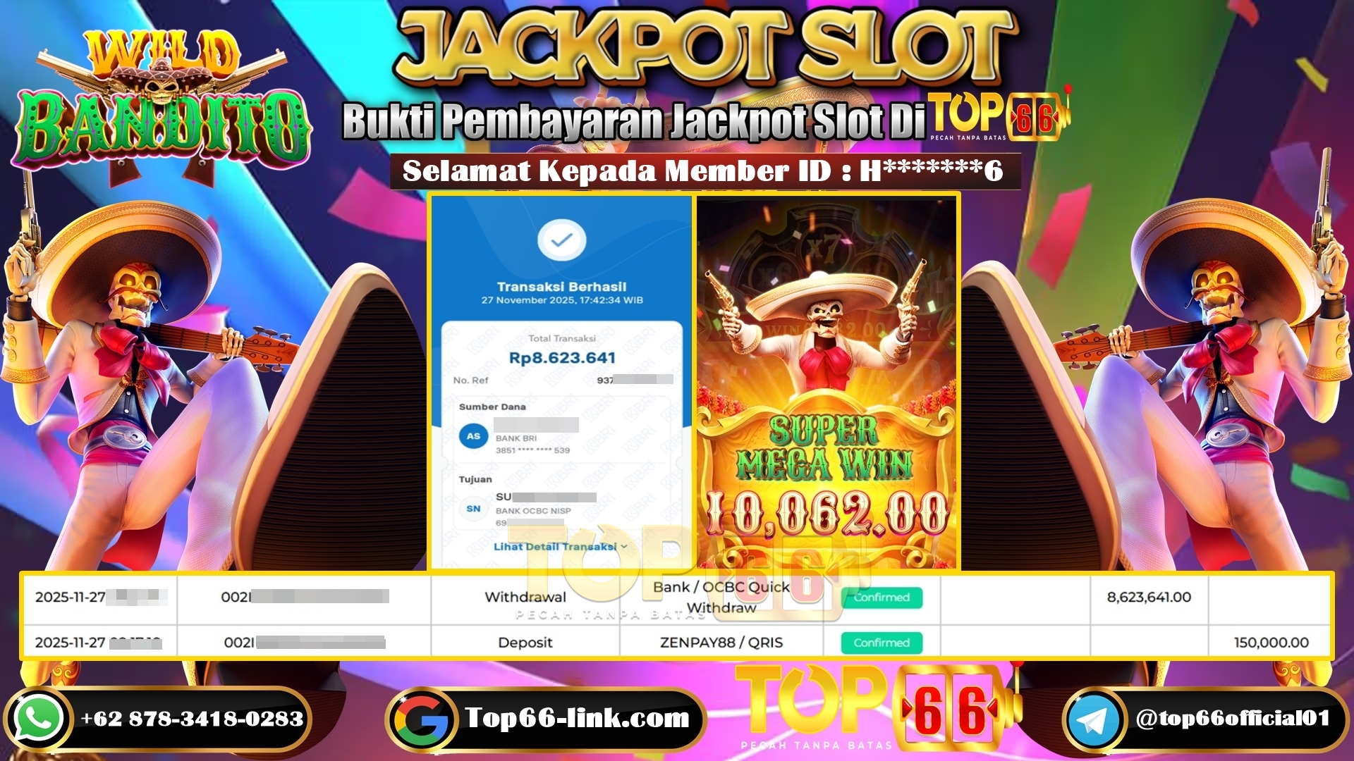 TOP66 – BUKTI KEMENANGAN SLOT WILD BANDITO Rp 8.623.641,- LUNAS Selamat Kepada Member ID : H*******6, Telah berhasil mendapatkan kemenangan…