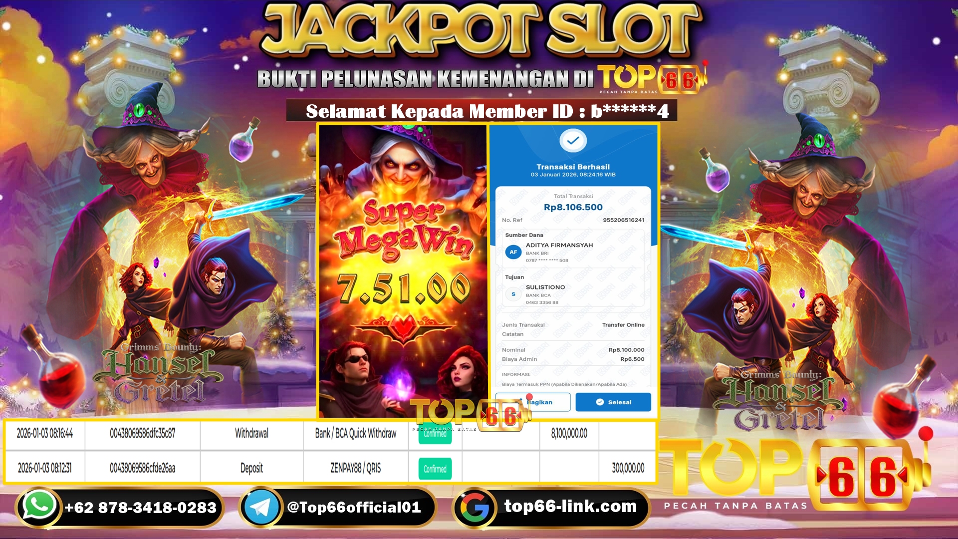 TOP66 – BUKTI KEMENANGAN SLOT GRIMMS BOUNTY: HANSEL & GRETEL Rp 8,100,000,- LUNAS Selamat Kepada Member ID : b*****4, Telah…
