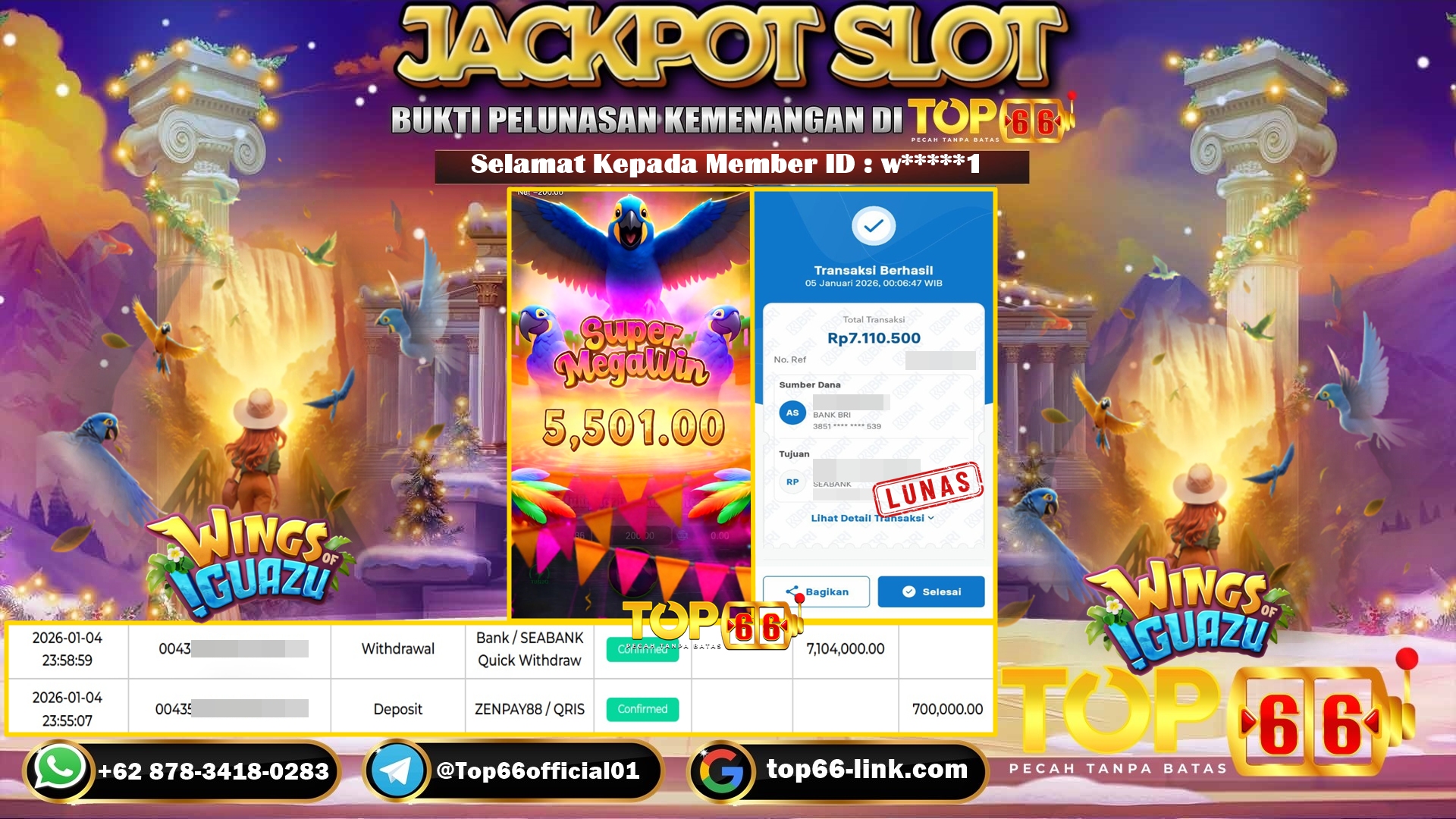 TOP66 – BUKTI KEMENANGAN SLOT WINGS OF IGUAZU Rp 7,104,000,- LUNAS Selamat Kepada Member ID : w****1, Telah berhasil mendapatkan…