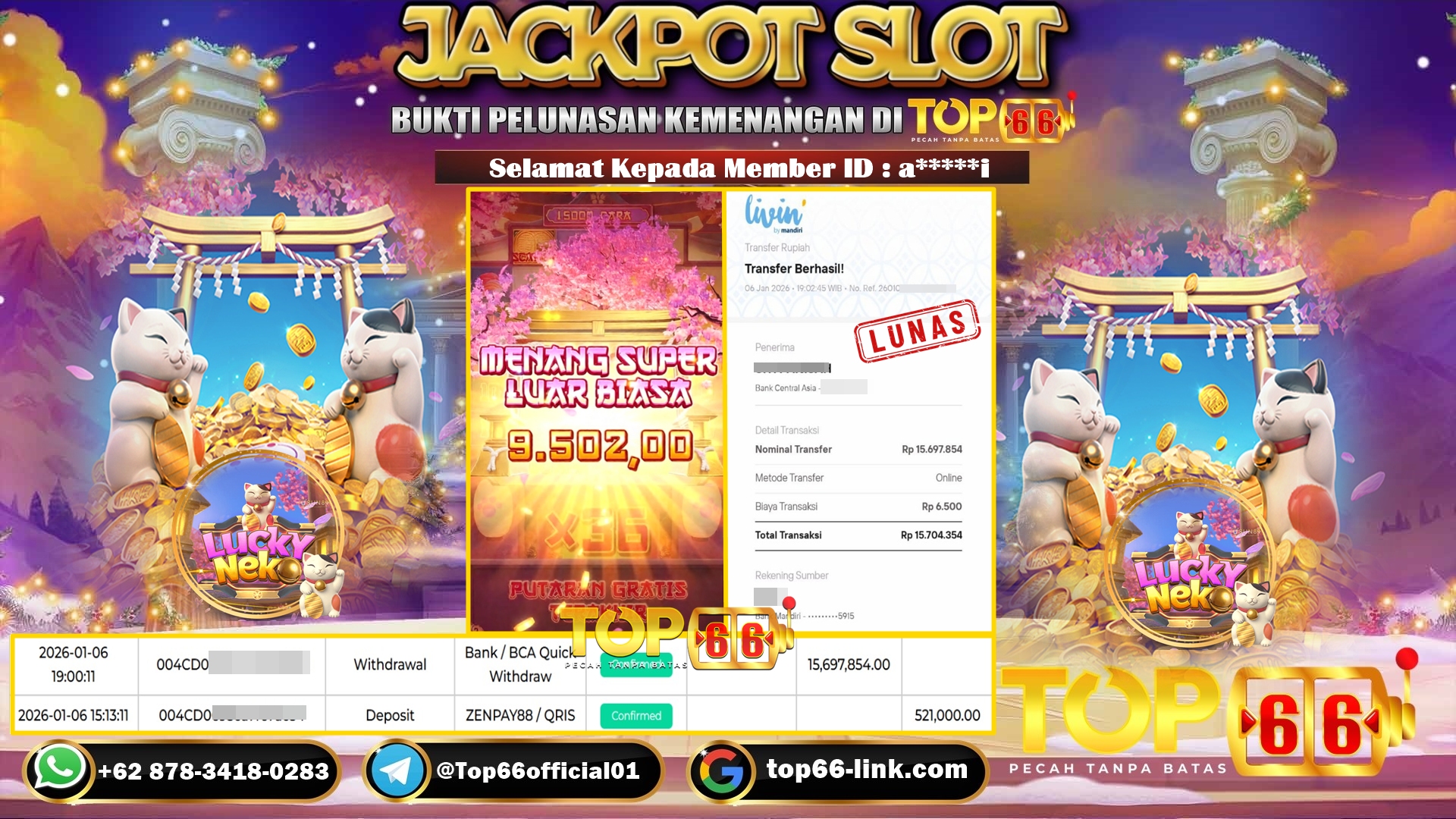 TOP66 – BUKTI KEMENANGAN SLOT LUCKY NEKO Rp 15,697,854,- LUNAS Selamat Kepada Member ID : a*****i, Telah berhasil mendapatkan kemenangan…
