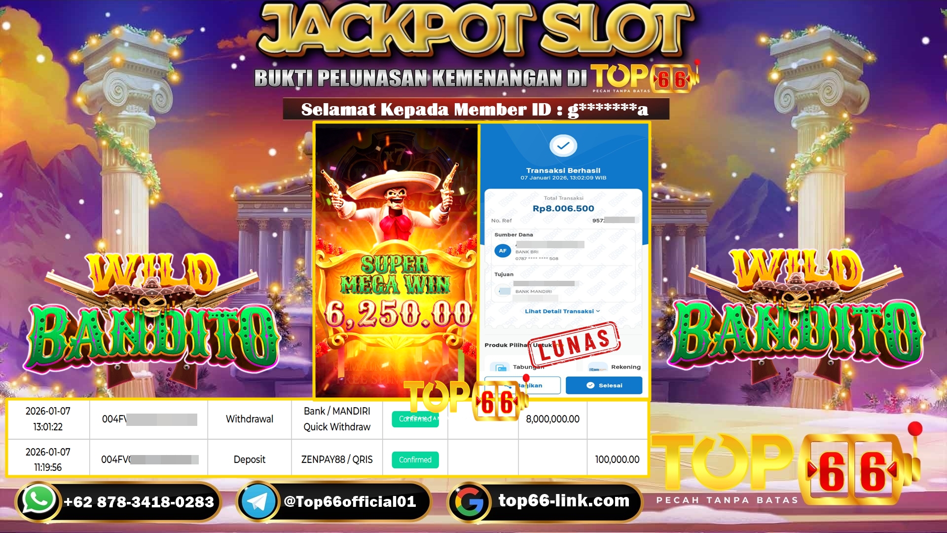 TOP66 – BUKTI KEMENANGAN SLOT WILD BANDITO Rp 8.000.000,- LUNAS Selamat Kepada Member ID : g*******a, Telah berhasil mendapatkan kemenangan…