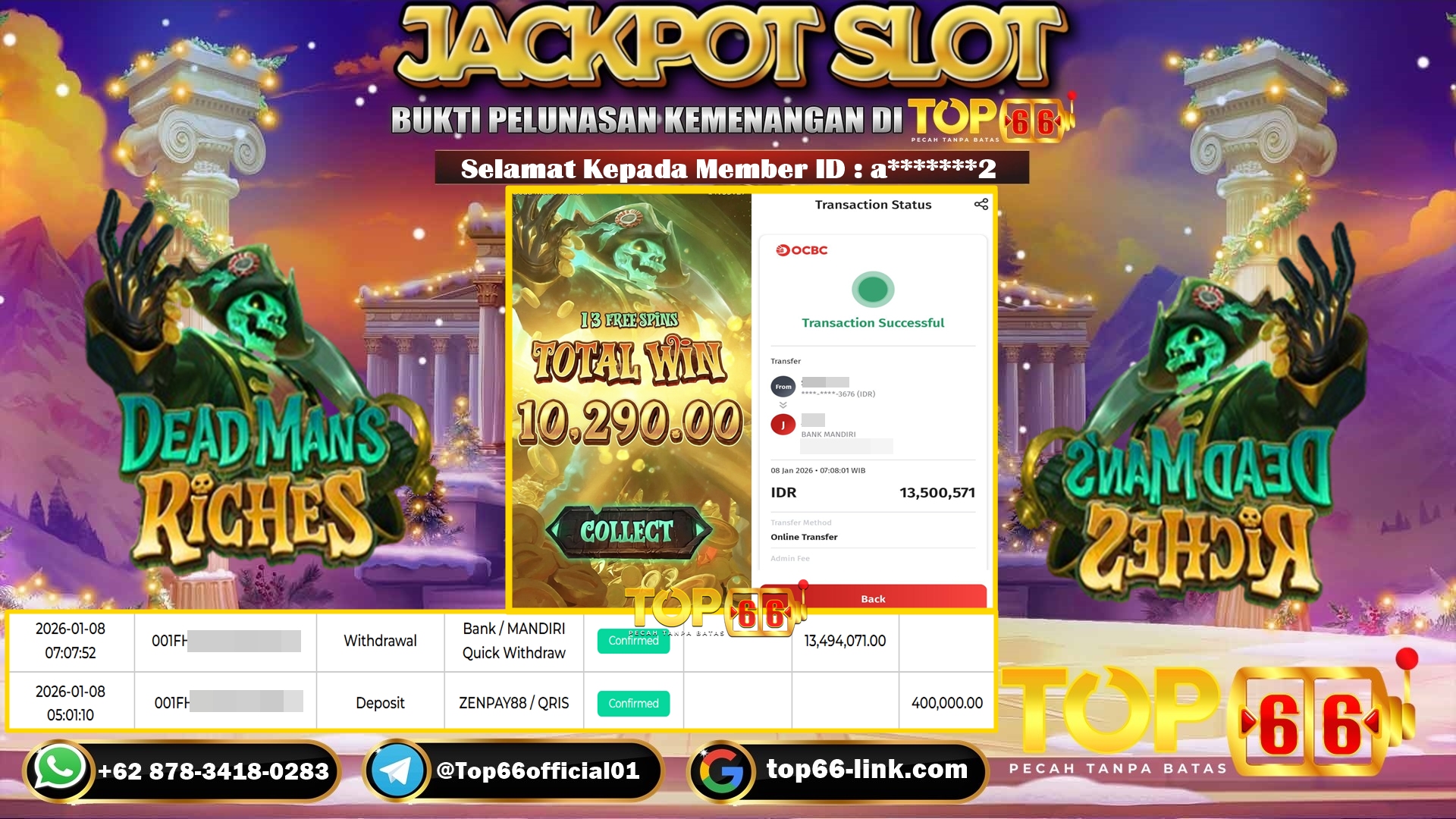 TOP66 – BUKTI KEMENANGAN SLOT DEAD MANS RICHES Rp 13,494,071,- LUNAS Selamat Kepada Member ID : a******2, Telah berhasil mendapatkan…