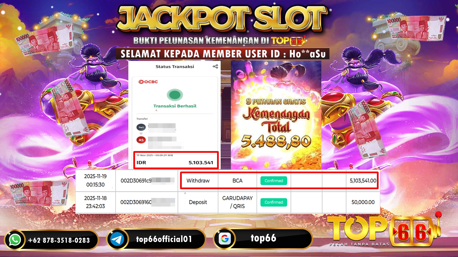 TOP66 – BUKTI KEMENANGAN SLOT Genie’s 3 Wishes Rp 5.488.800,- LUNAS Selamat kepada User id : Ho**aSu, Telah berhasil mendapatkan…