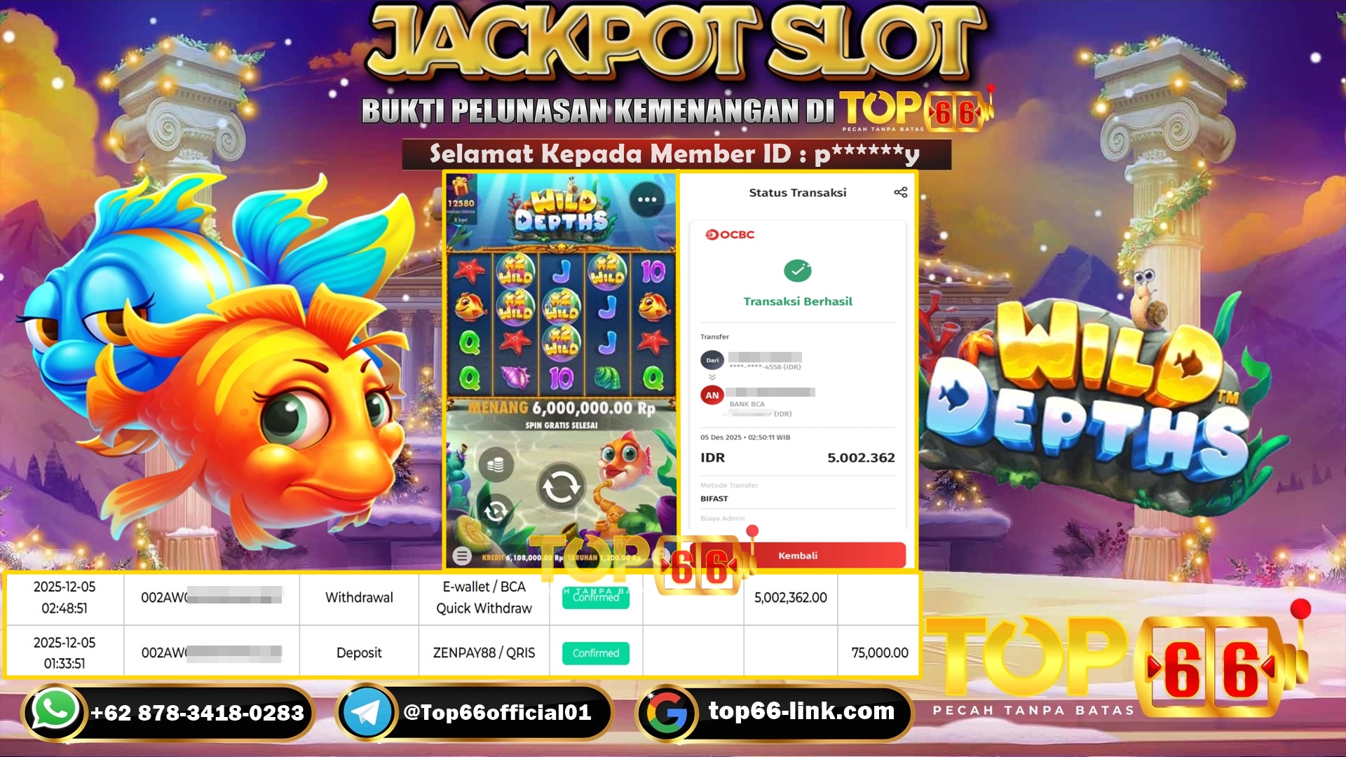 TOP66 – BUKTI KEMENANGAN SLOT Wild Depths Rp 5.002.536,- LUNAS Selamat Kepada Member ID : p******y, Telah berhasil mendapatkan kemenangan…