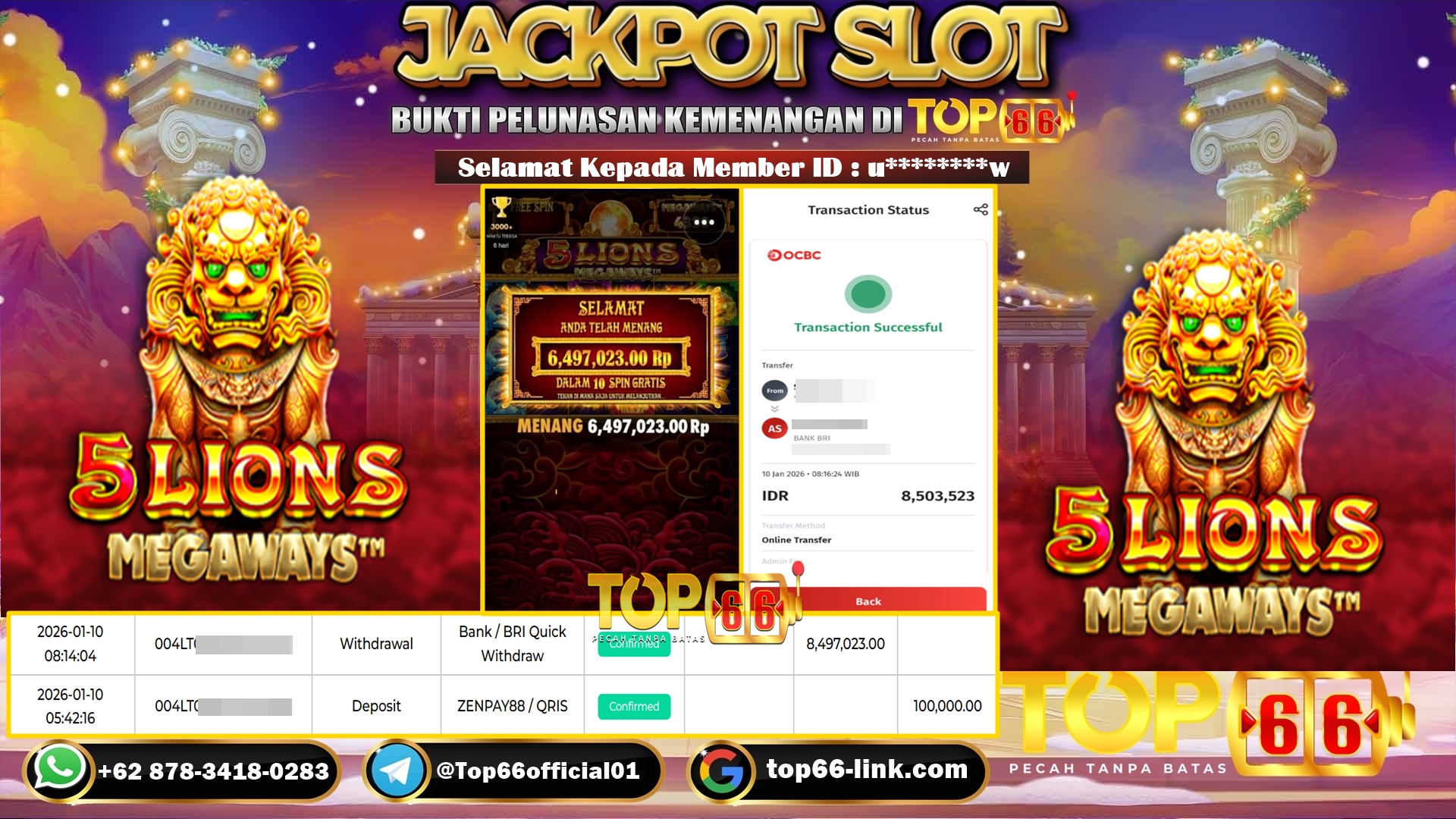 TOP66 – BUKTI KEMENANGAN SLOT 5 LIONS MEGAWAYS Rp 8,497,023,- LUNAS Selamat Kepada Member ID : u*********w, Telah berhasil mendapatkan…
