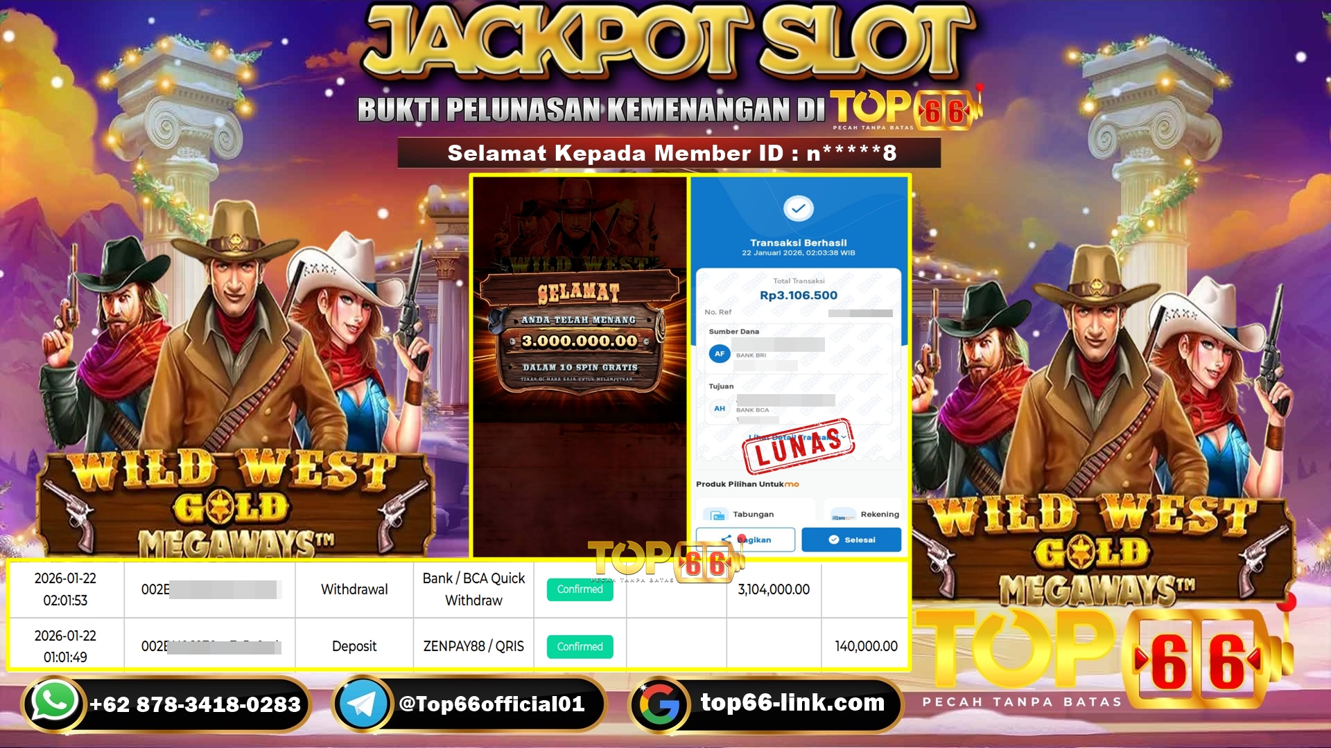TOP66 – BUKTI KEMENANGAN SLOT WILD WEST GOLD MEGAWAYS Rp 3,104,000,- LUNAS Selamat Kepada Member ID : n*****8, Telah berhasil…