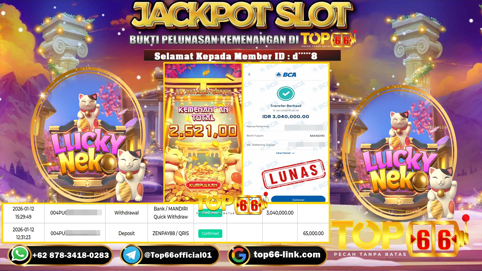 TOP66 – BUKTI KEMENANGAN SLOT LUCKY NEKO Rp 3,040,000,- LUNAS Selamat Kepada Member ID : d****8, Telah berhasil mendapatkan kemenangan…
