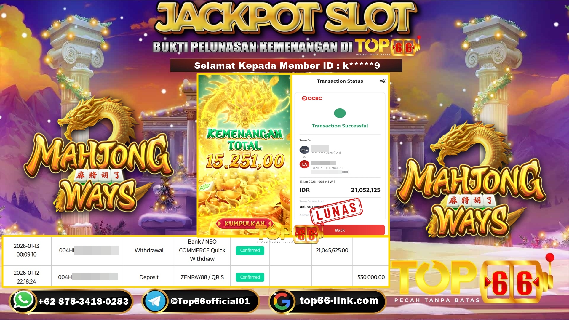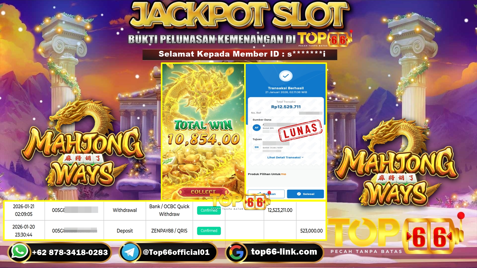 TOP66 – BUKTI KEMENANGAN SLOT MAHJONG WAYS Rp 12,523,211,- LUNAS Selamat Kepada Member ID : s*******i, Telah berhasil mendapatkan kemenangan…