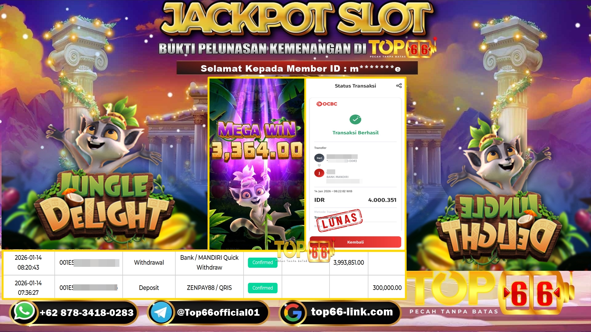 TOP66 – BUKTI KEMENANGAN SLOT JUNGLE DELIGHT Rp 3,993,851,- LUNAS Selamat Kepada Member ID : m*******e, Telah berhasil mendapatkan kemenangan…