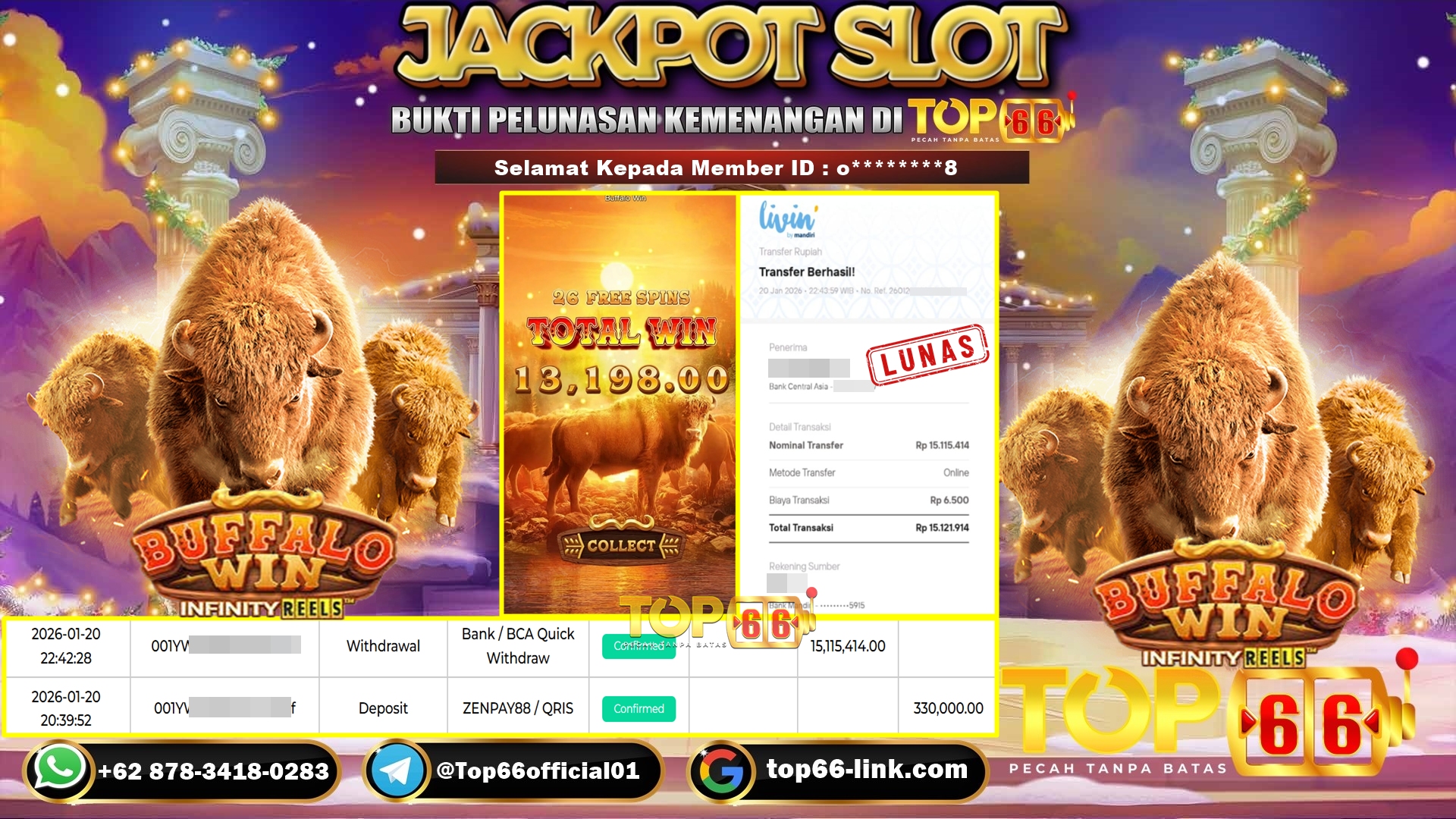 TOP66 – BUKTI KEMENANGAN SLOT BUFFALO WIN Rp 15,115,414,- LUNAS Selamat Kepada Member ID : O********8, Telah berhasil mendapatkan kemenangan…
