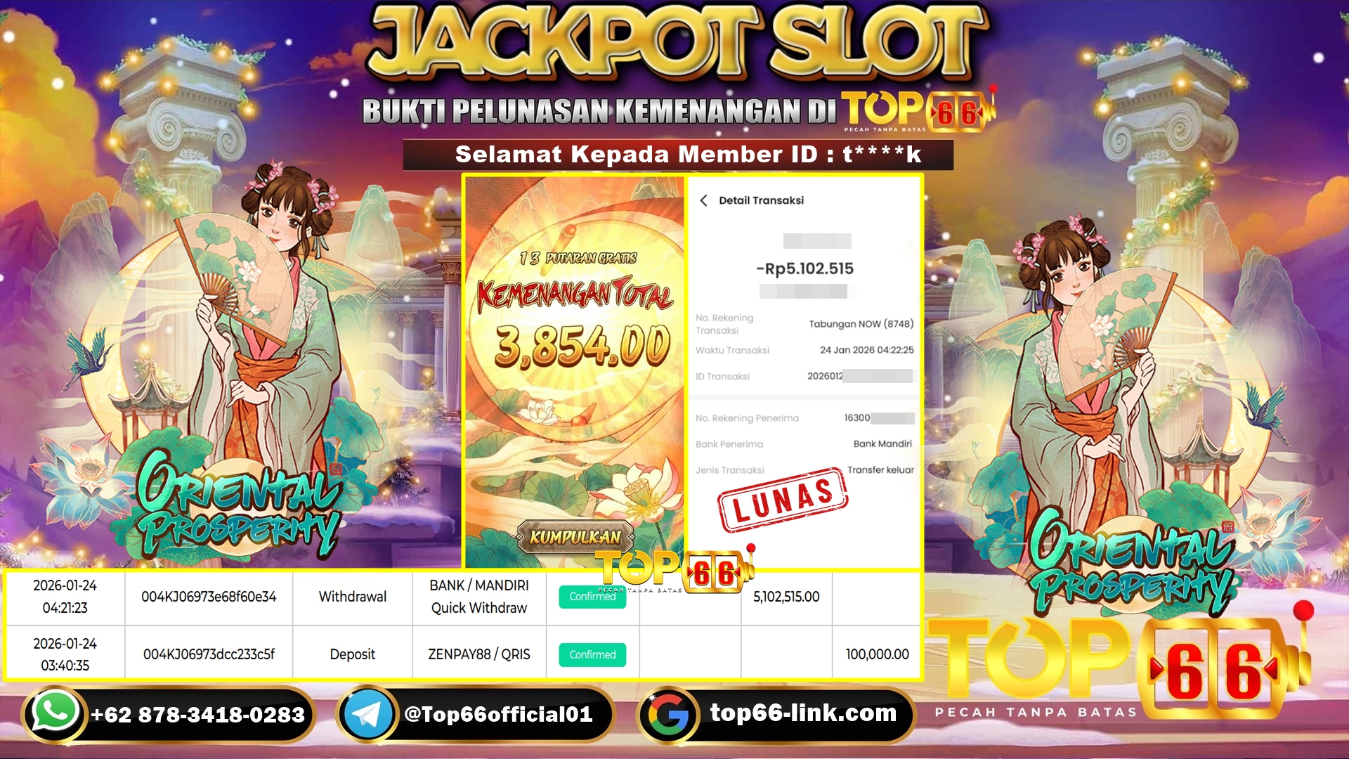 TOP66 – BUKTI KEMENANGAN SLOT ORIENTAL PROSPERITY Rp 5,102,515,- LUNAS Selamat Kepada Member ID : t****k, Telah berhasil mendapatkan kemenangan…