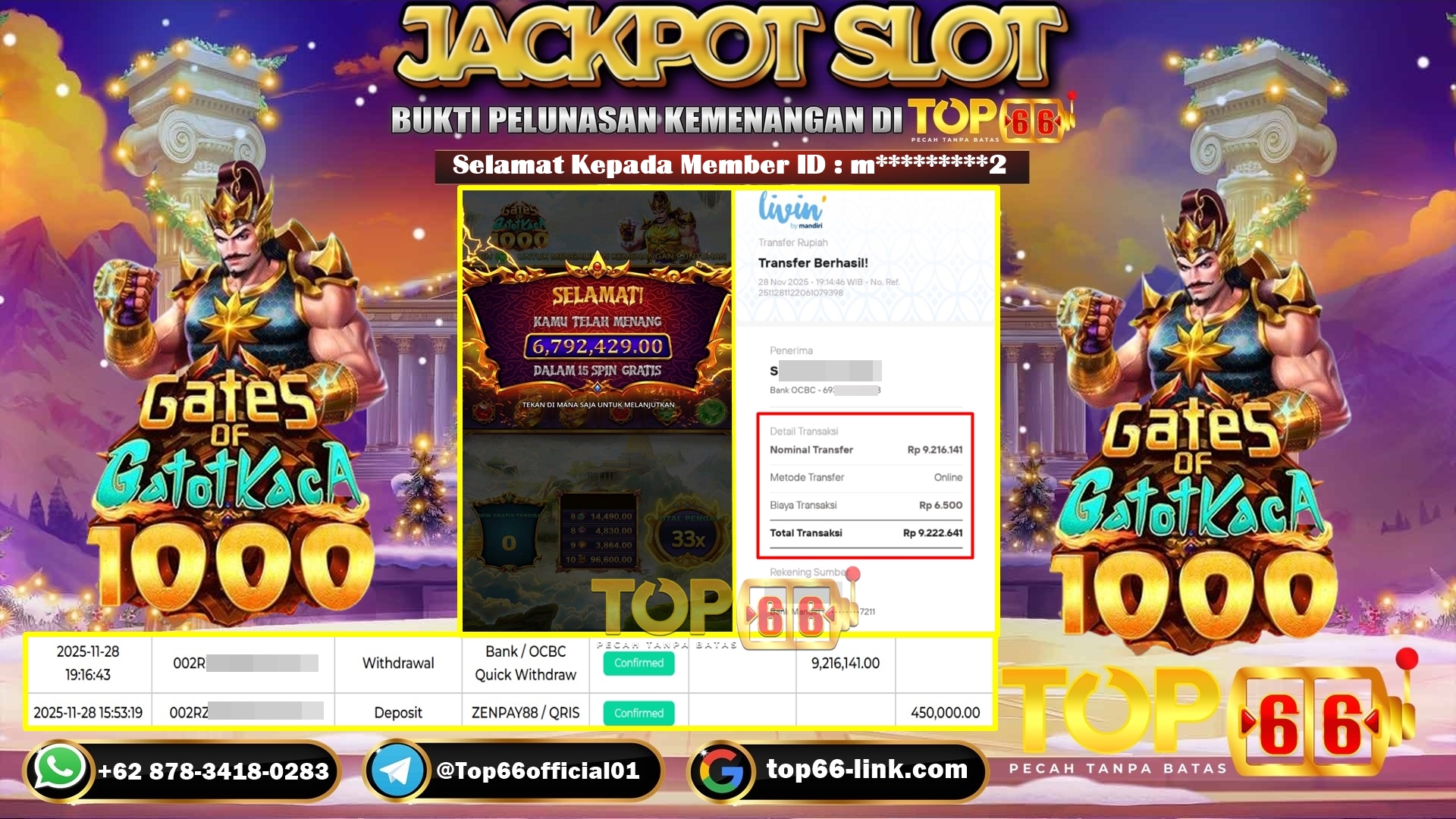 Selamat Kepada Member ID : u******6, Telah berhasil mendapatkan kemenangan besar pada permainan SLOT MAHJONG WINS 3 – BLACK SCATTER kemenangan Sebesar Rp. 8,890,575,- Setelah mengisi form withdraw dengan kurung waktu hanya 3 – 5 menit pihak TOP66 sudah melakukan transfer kepada pemilik Userid dan dana sudah dapat di cairkan oleh pemenang. Bukti pembayaran yang kami berikan merupakan bukti pembayaran yang SAH / VALID yang langung di dapatkan melaui tanda transfer transaksi dari Bank yang di tuju.